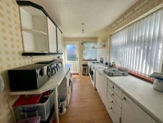 To the right of the hallway, you'll find the kitchen, fitted with a range of wall and base units and offering a second access point to the rear garden – perfect for indoor-outdoor living.